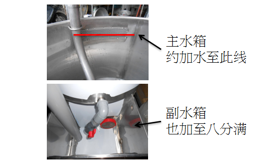 1.將電源開關打開,將水加於主水箱及副水箱中,加至八分滿,讓水循環。