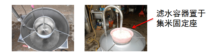 2.水正常循環後,再將預備洗的米倒於桶內,待洗3~5分鍾後,將濾水容器置於集米固定座,收集洗好的米或將米和水抽於外桶內亦可以。